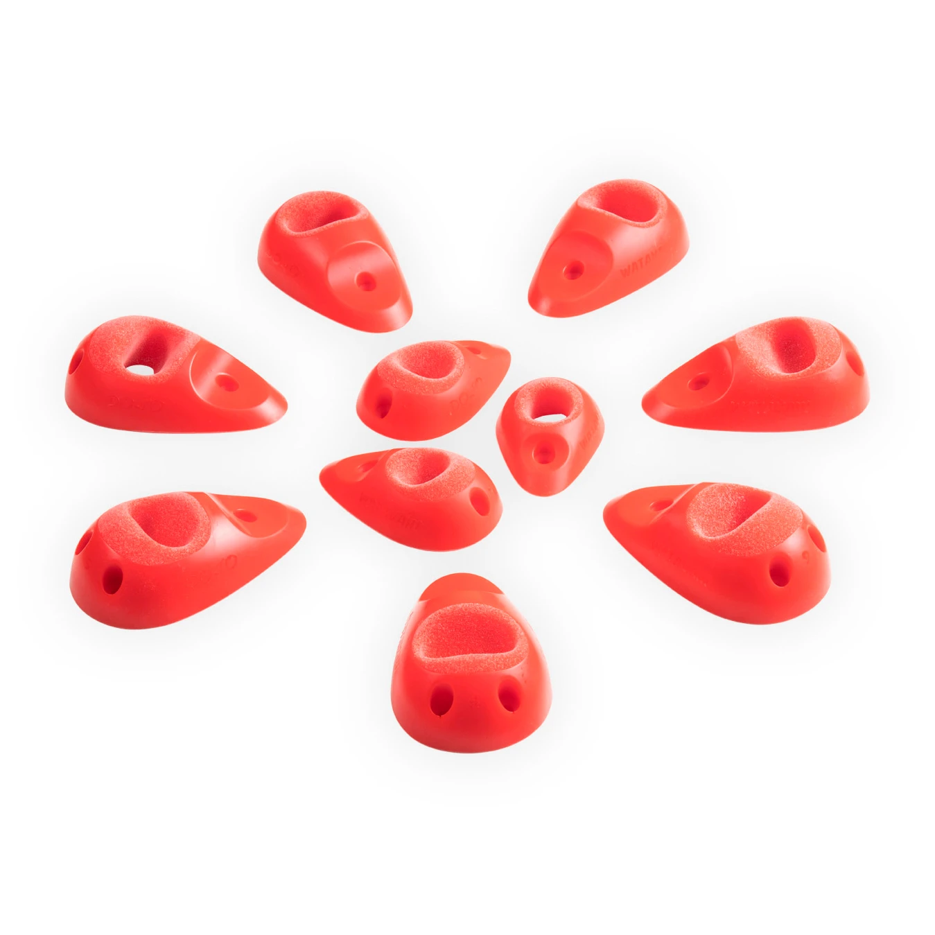 Das Dojo 6 Set von Wataah besteht aus zehn Lochgriffen, welche Du einfach mit normalen Schrauben an Deiner Boulderwand befestigst. Die Griffe sind ergonomisch geformt und besitzen eine sehr feine Oberfläche. Diese schont die Haut, wodurch die Dojo-Griffe ideal für das tägliche Training geeignet sind. Sie eignen sich für den Anfänger ebenso wie für den Profi und können an Überhängen von 20 bis 45° Neigung verwendet werden.