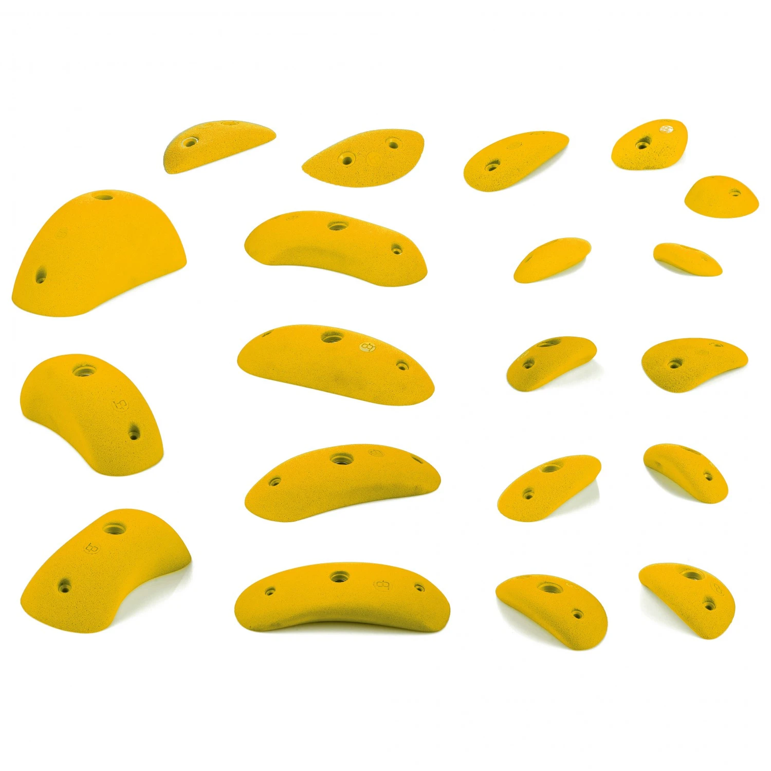 Wer sich auch zu Hause gern richtig die Finger langziehen möchte, sollte sich das Hard Boulder Set von blue pill mal näher ansehen! Das Set besteht aus zwanzig kleinen bis mittelgroßen Griffen in verschiedenen Formen – von kleinen Jugs und Auflegern bis Pinches ist alles dabei, um anspruchsvolle Boulder zu kreieren. Die Griffe bestehen aus griffigem, einfach zu reinigendem Polyester und sind innen hohl für ein geringeres Gewicht. Bis zu drei Löcher für M10-, Senkkopf- oder Zylinderschrauben bieten genug Möglichkeiten, die Griffe fest an der Wand zu verankern.