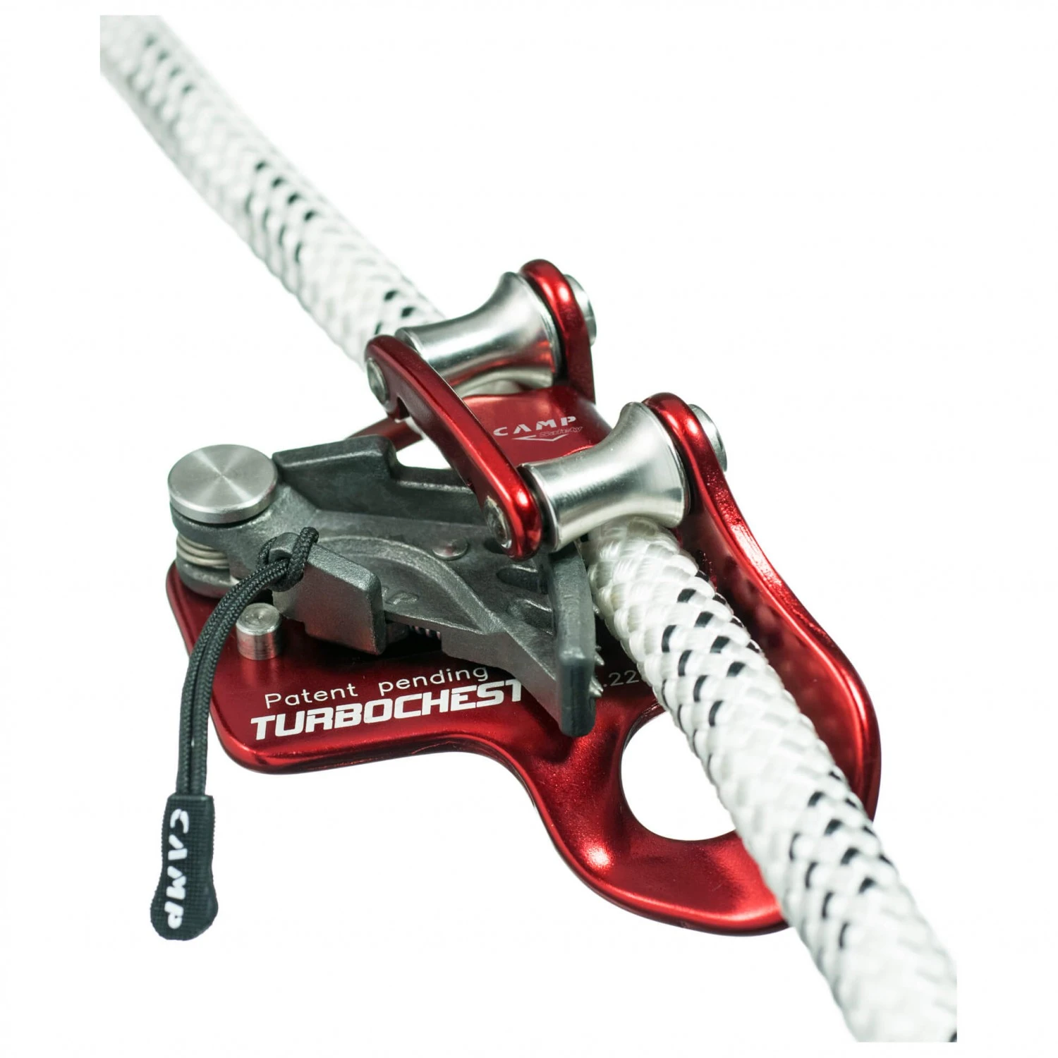 Einen besonders hohen Sicherheitsstandard hat die Bruststeigklemme Turbochest von Camp , die eigens für Speläoeinsätze konstruiert wurde. Ihre ergonomische, kompakte Konstruktion mit den beiden Riemenscheiben verbessern den Wirkungsgrad und reduzieren den gefährlichen Wangenverschleiß. Verzahnte Nocken mit verschleißfester Spezialbehandlung und mit speziellen Ablaufmöglichkeiten für Schlamm, Schmutz und Eis führen zu einem geringeren Verschleiß von Seil und Klemme. Die Haupt-Einhängeöffnung am Brustgurt ist leicht gedreht, was die Geräteposition vor der Brust optimiert.